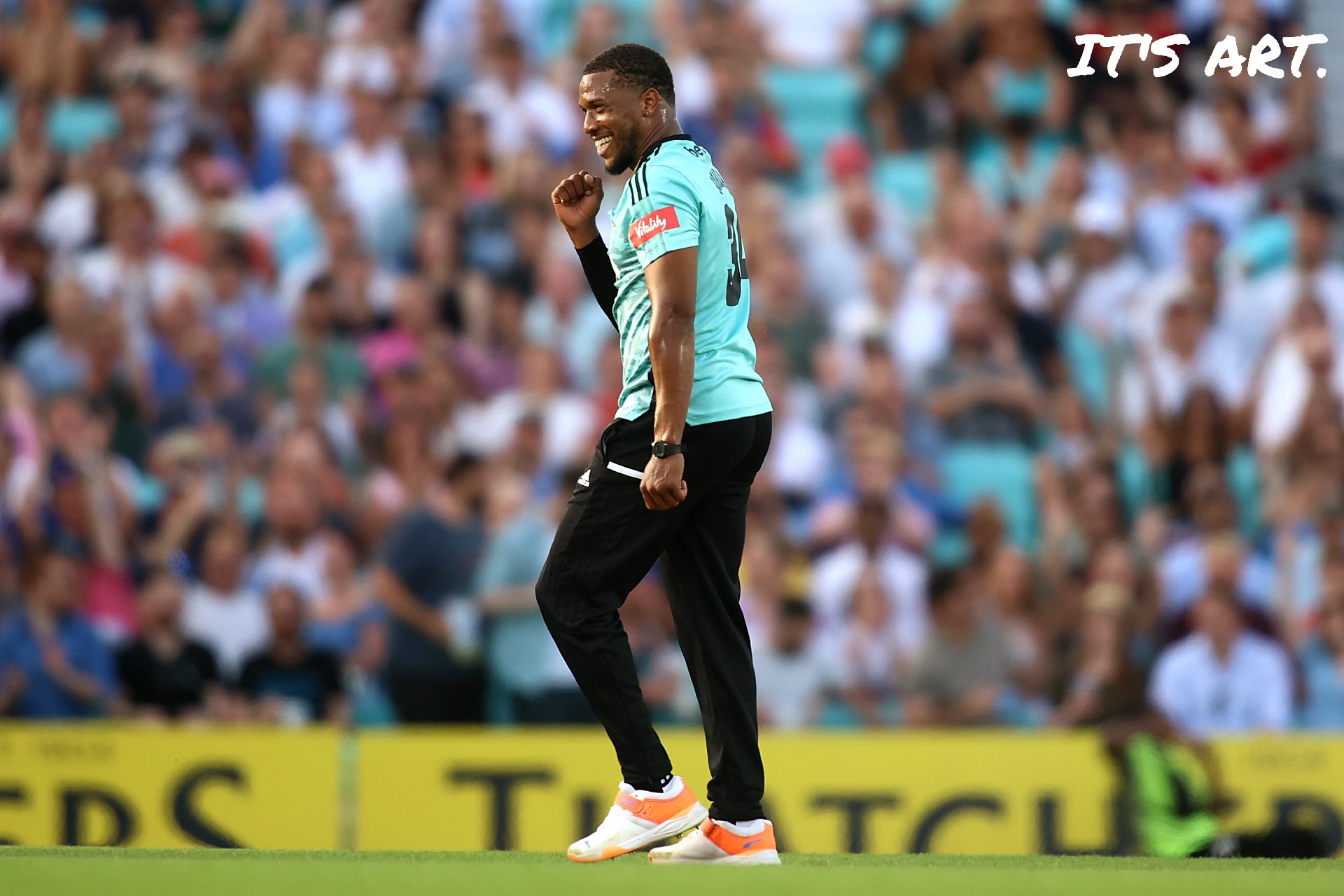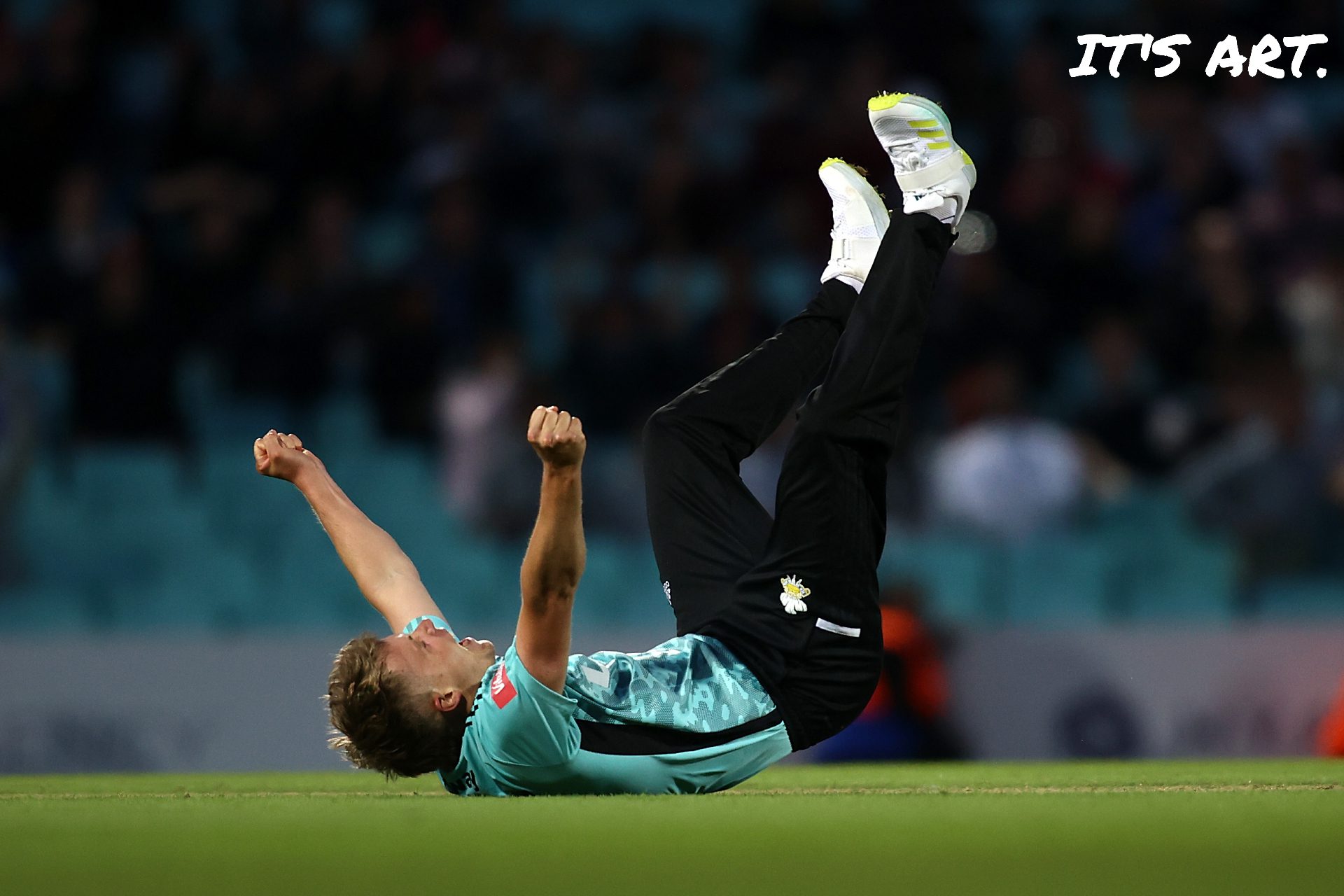 This picture was taken as he celebrates a wicket falling during the Vitality T20 Blast match between Surrey and Middlesex at The Kia Oval on June 17, 2022.