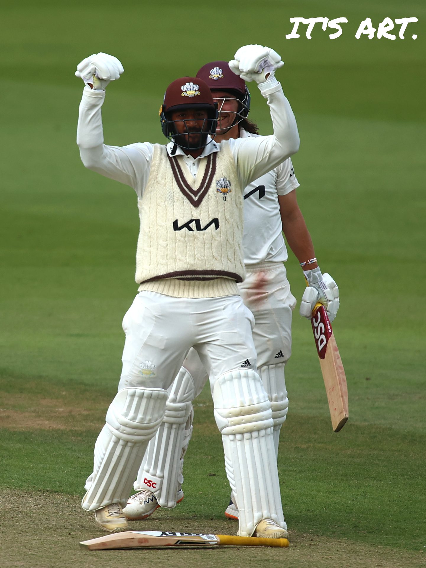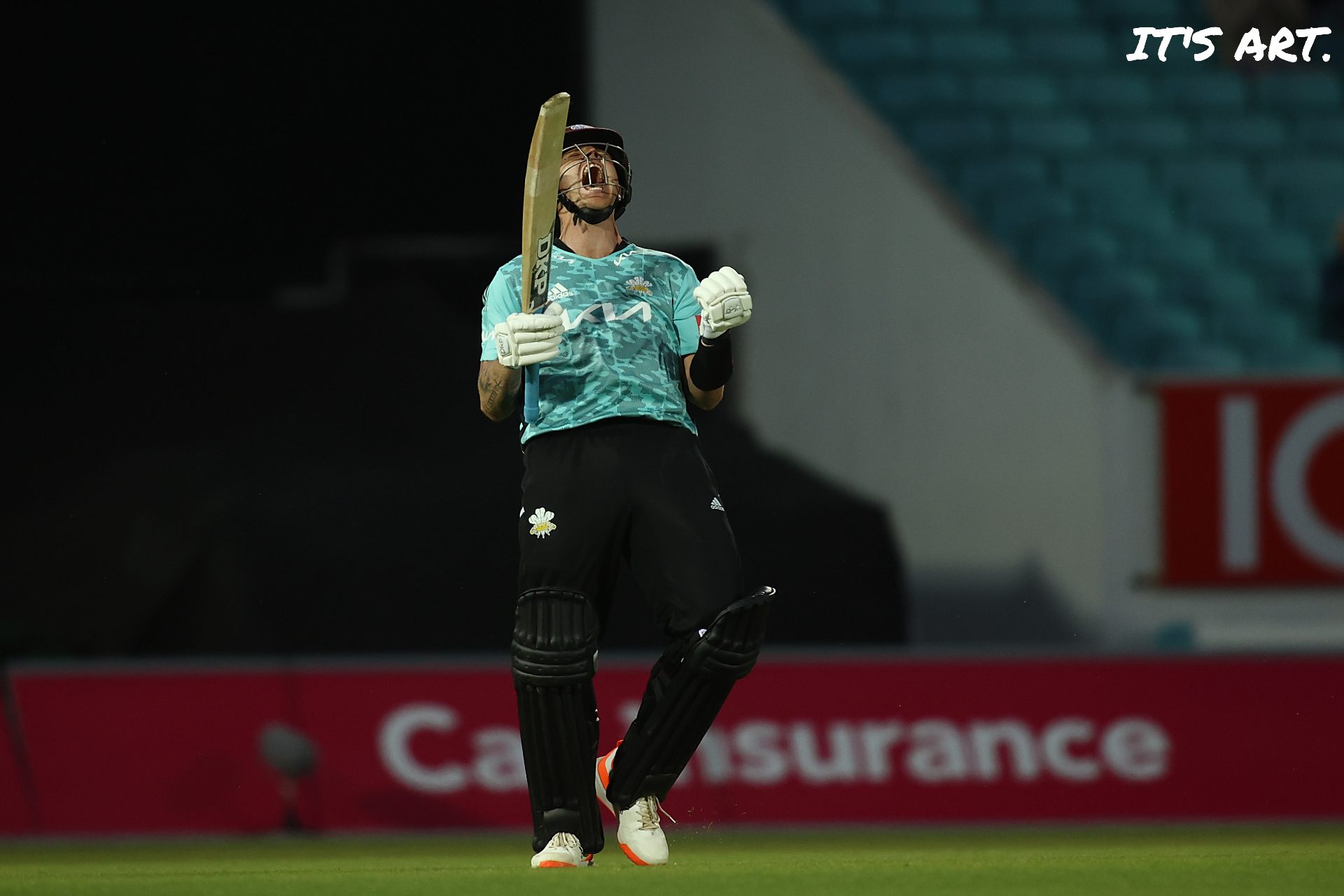 In this picture he is celebrating Surrey being crowned County Championships in September 2022, gesturing to the dressing room.
